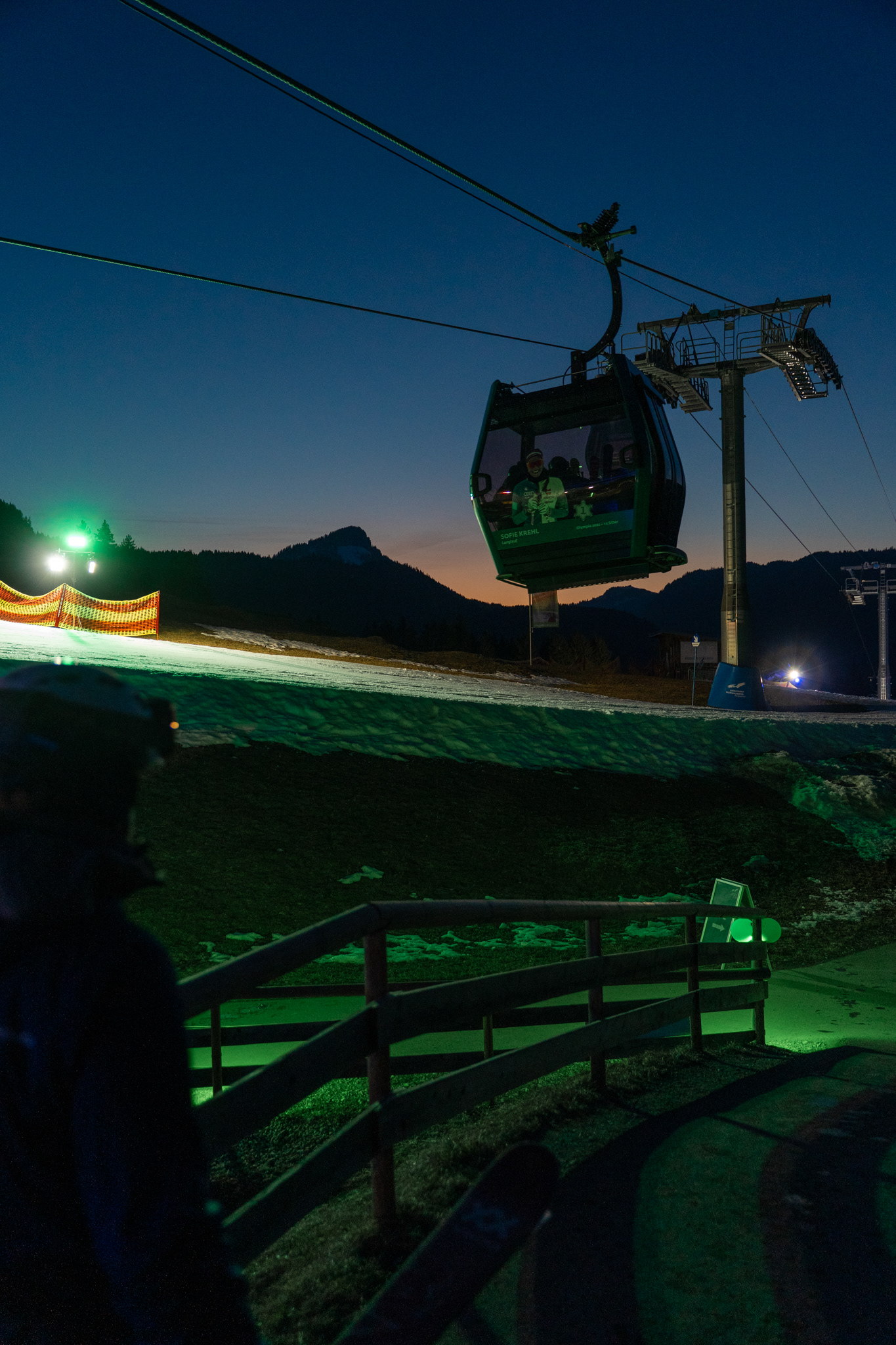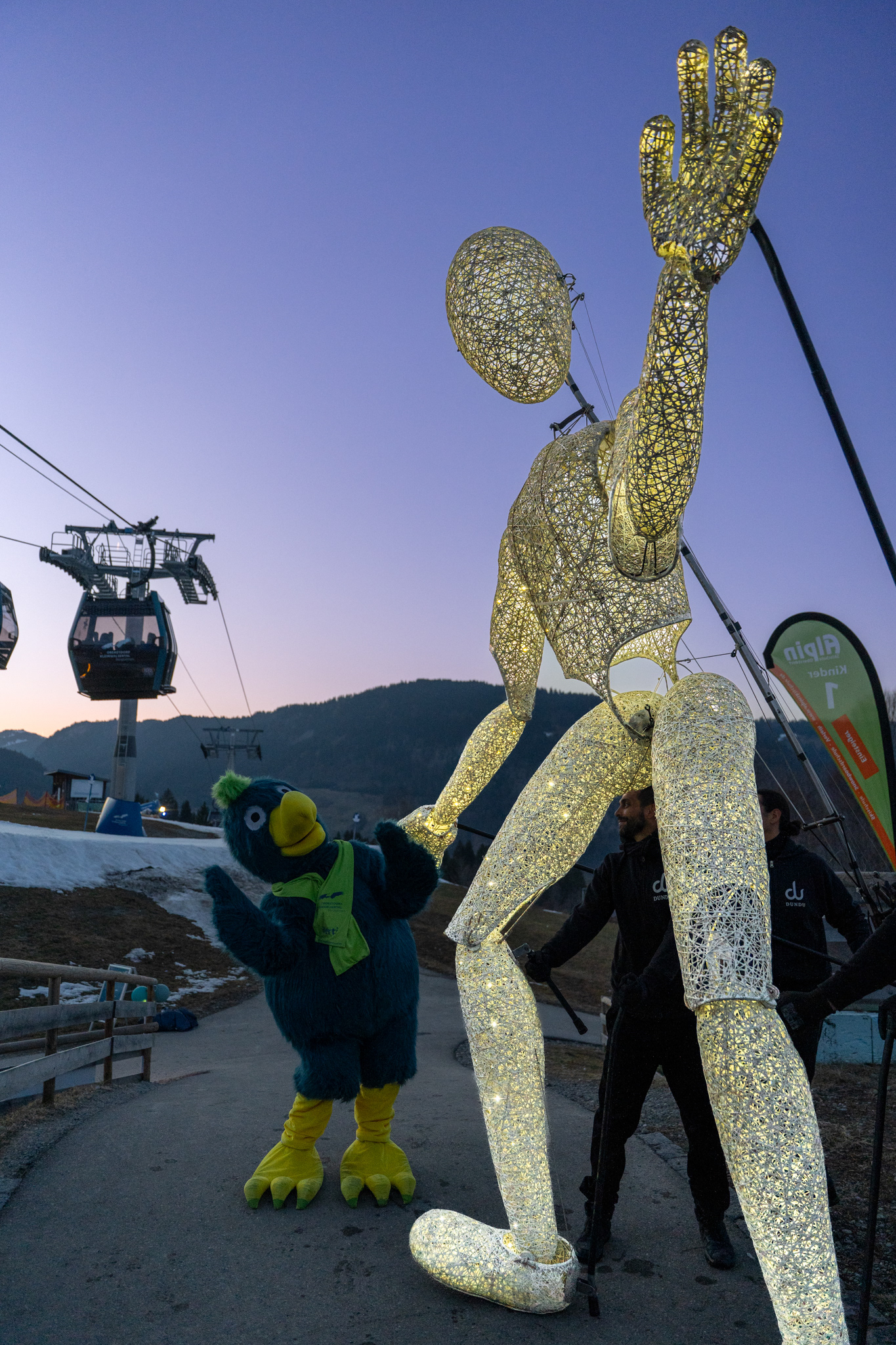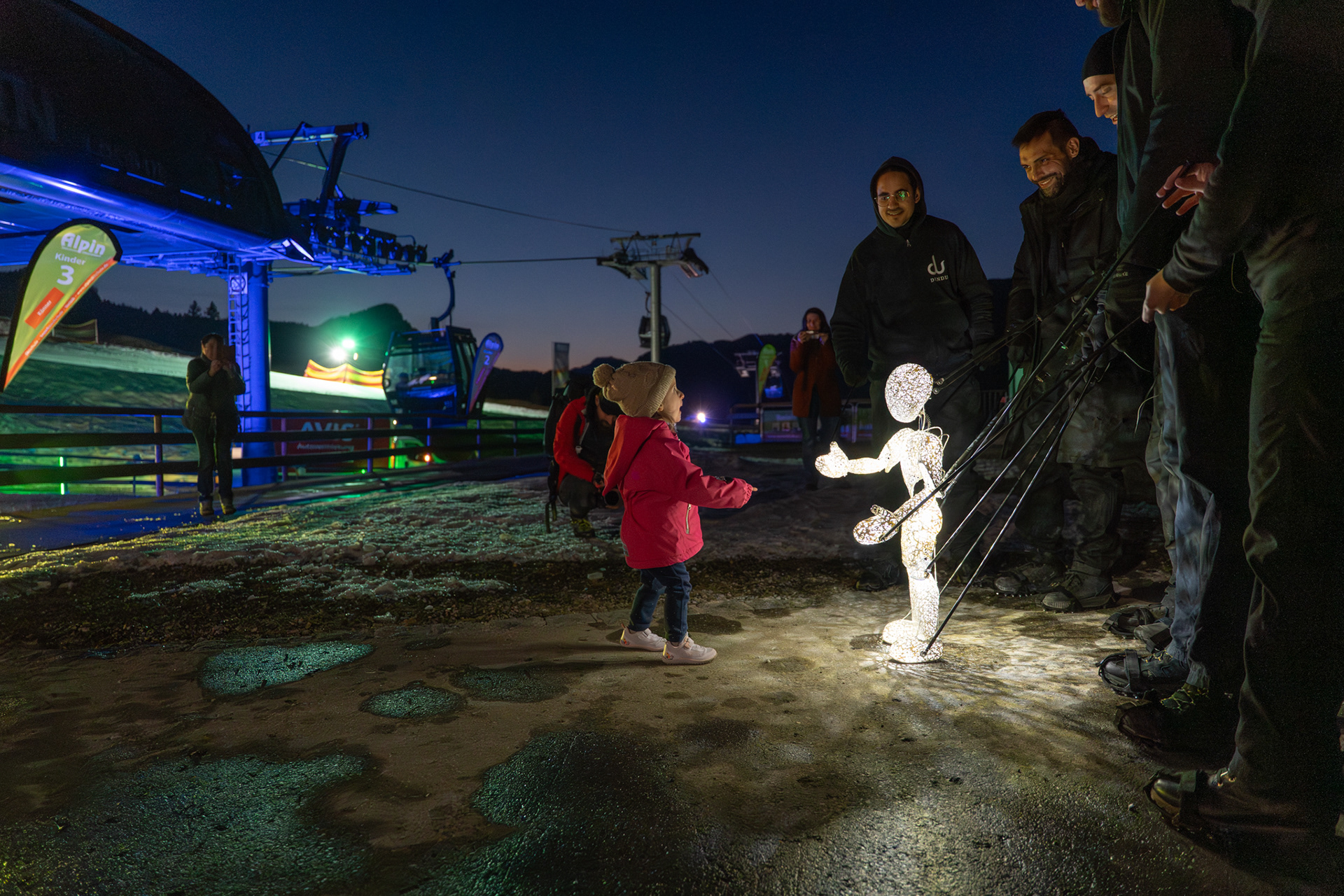 Stellen Sie sich vor: Ein vier Meter hoher, leuchtender Riese und sein kleiner Begleiter verzaubern die Menge. Der magische Moment, als eine bloße Berührung des großen DUNDU die Söllereckbahn in Gang setzte, war der Startschuss für ein einmaliges Nachtskifahren im Sonnenuntergang. Diese Dynamik zwischen Lichtkunst und alpiner Mechanik fotografisch festzuhalten, war ein absolutes Highlight meiner bisherigen Laufbahn.