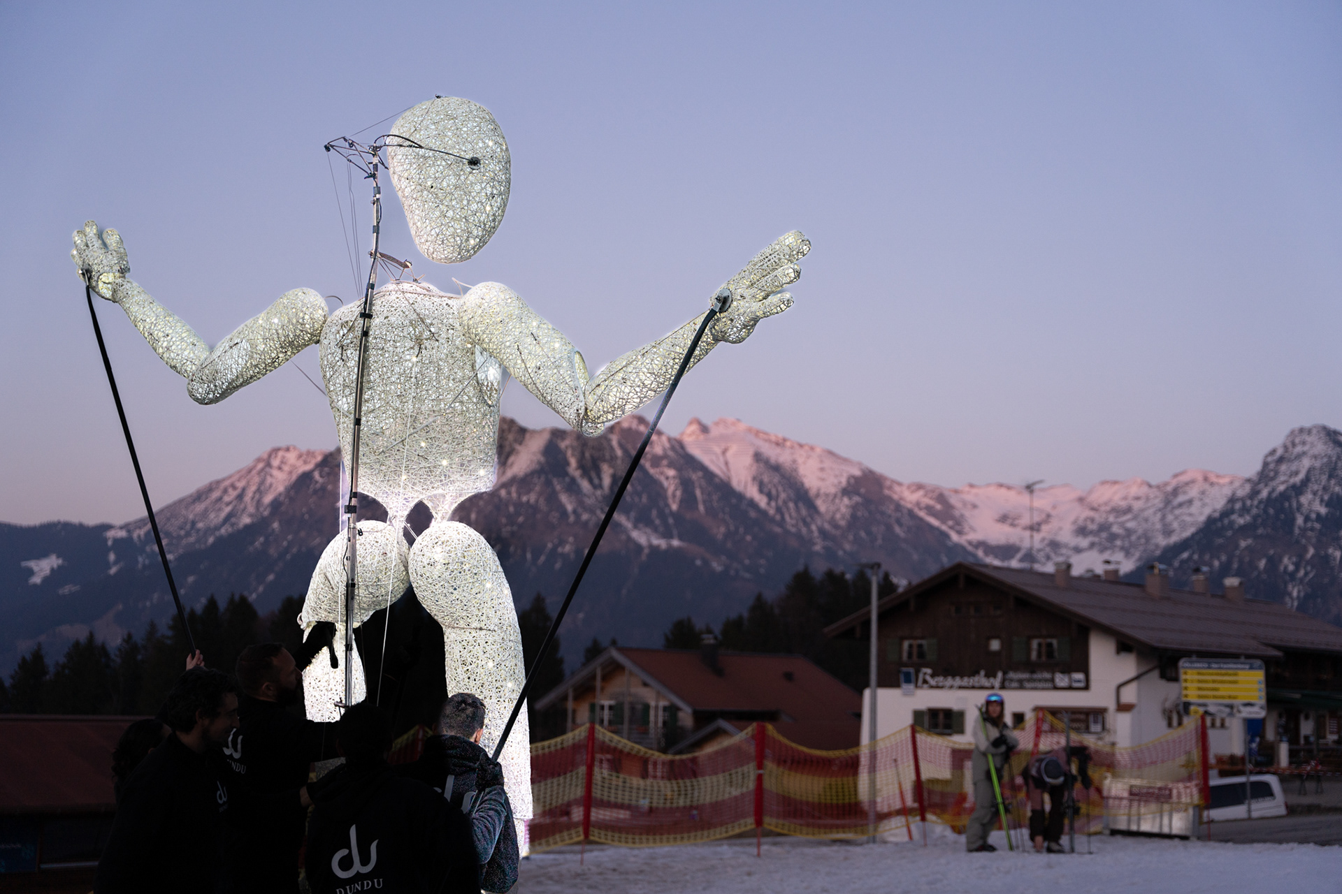 Der absolute Höhepunkt war der Übergang von der festlichen Gondelgarage hinaus in die Oberstdorfer Nacht. Begleitet von Seearts und ihren faszinierenden Lichtgestalten DUNDU, bewegte sich die Gesellschaft nach draußen.